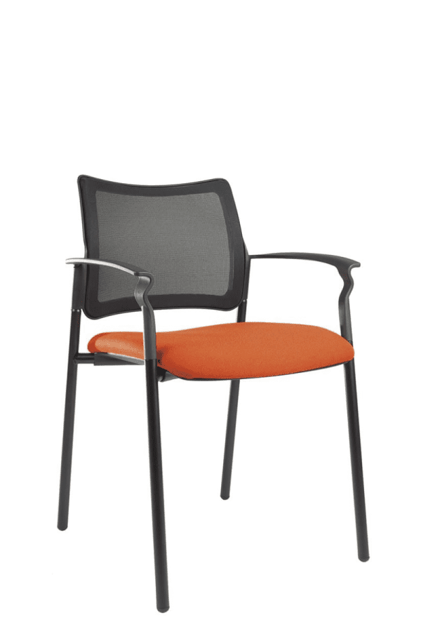 Konferencijski stolac niskog naslona sa rukonaslonima izrađenim od visokokvalitetnog polipropilena i naslonom u mreži crne boje.